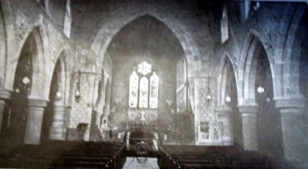 This grainy image was taken in the mid 1920s inside the church which was built in 1866 at the cost of £3,500. Built of red sandstone in the Early English style, it consists of chancel, a clerestoried nave of five bays, aisles, south porch and a western turret containing one bell. It is capable of seating 600 people.